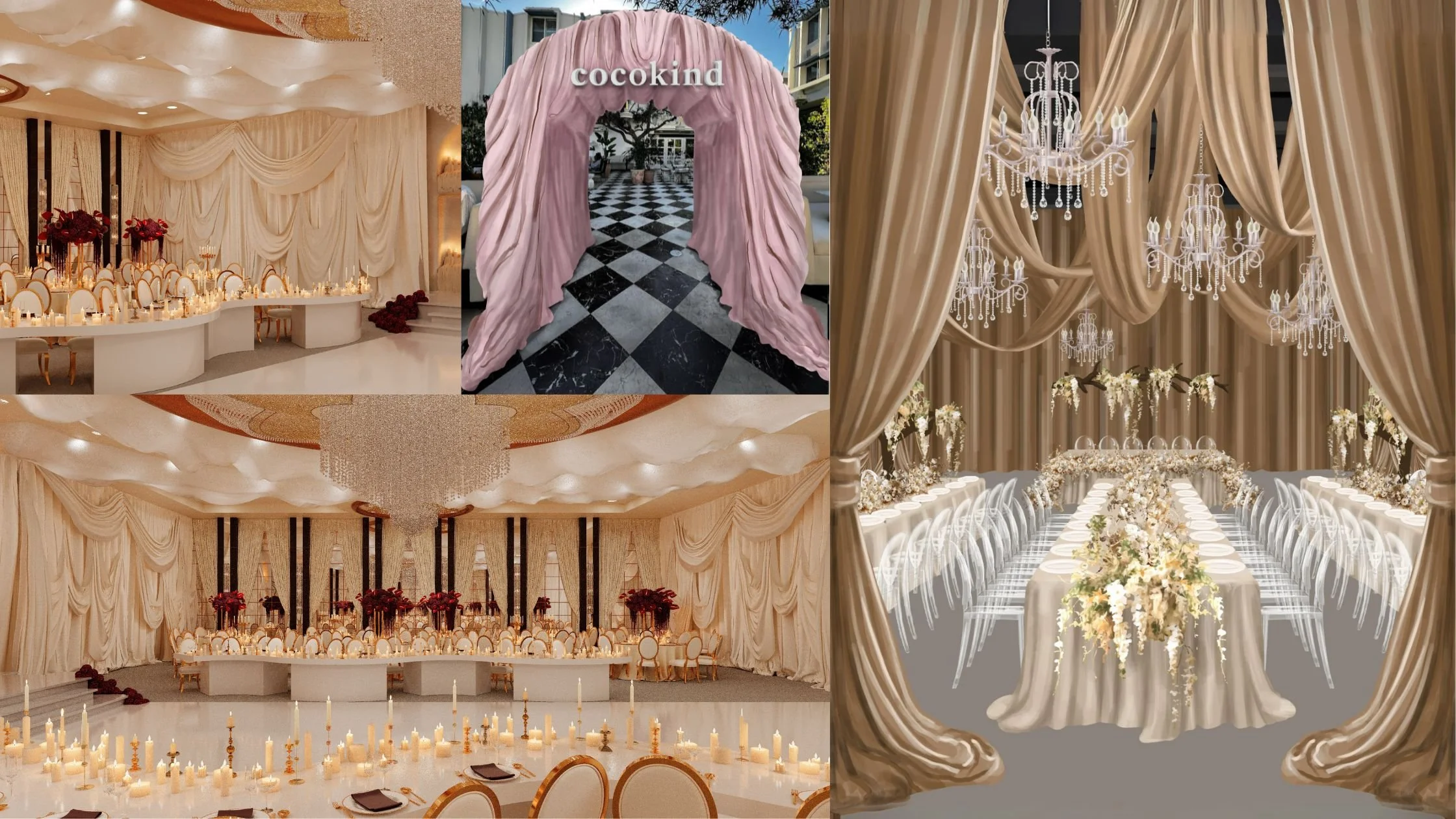 Romance and luxury are at the forefront with billowy, parachute-style draping. These volumetric fabrics create an ethereal, almost dreamlike atmosphere, perfect for weddings and upscale events.